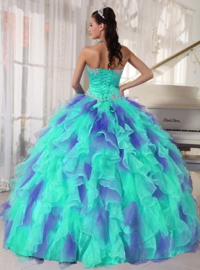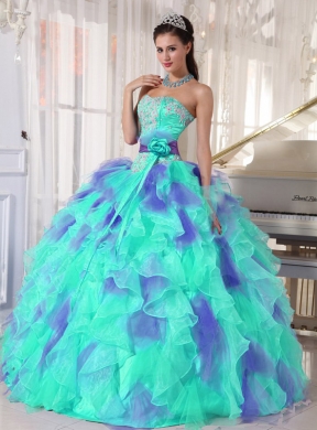 This gorgeous quinceanera ball gown features a fitted, strapless neckline accented with appliques in the bodice.The waist of this ruffled quinceanera dress was wrapped with ruched ribbons around waist which is decorated with a rosette flower.