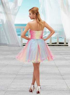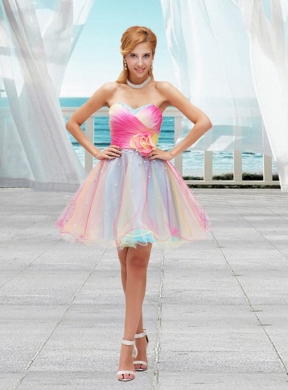 Set a new standard for party style with this strapless Cocktail creation from Fashionos! Its form-fitting sweetheart bodice is totally bedecked with crossed, ruching fabric. The big flower on the waist and the hidden zipper in the back add cuteness to this mini prom gown. The colorful fun continues on the flared skirt, which consists of layers of contrasting, whisper-thin material and culminates in a dreamy, ruffled hem.
