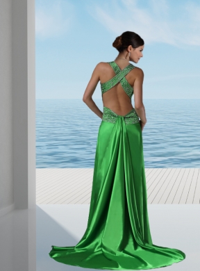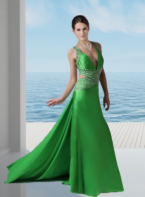 This spring green prom dress is so exquisite that will make you the most popular one. It features two straps with the beadings all over the waist area. The sexy bodice is highlighted with the deep v-neck neckline. The comfortable skirt flows freely to the floor with the sweep train in the back to completes this luminous design. Bring it to your home, and you will can not wait to attend the prom.
