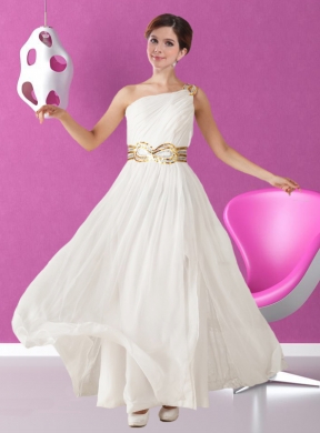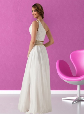 This white prom dress is your perfect choice to attend your party.The fitted bodice is adorned with one shoulder and ruchings throughout.The waistband in a waist area contures your natural waistline and the graceful skirt flows freely to the floor to create a beautiful shape.A zipper up back in the side completes this stunning dress.