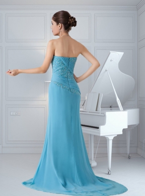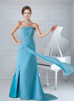This is a shimmering gorgeous blue prom dress! The dress accented with heavily beaded strapless bodice, and the flowy chiffon fabric encrusts over the bodice to define your slim figure.The split below the waistline creats the sexy and mordern stylish of the dress.It is really a sexy and flity dress to joy the party!