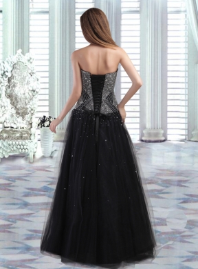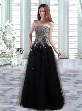 This dazzling black strapless prom dress is featured with the shimmering beads on the bodice.And the fun and triangle shaped beading at the waist adds more flirt to the dress, Covered with net, the dress gives a sense of mystery,A perfect dress for your special date!