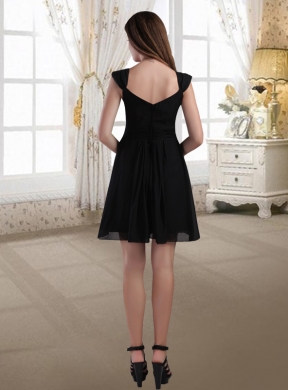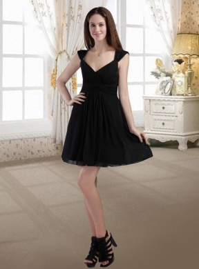 This black mini-length bridemaid dress has all the elements to make it a classic. The dress features fashionable straps and a sexy V-neck which add interest to the bust. Exquisite ruching accents your waist and gives a slimmer apperance.Soft chiffon mini-skirt flows freely to the knee. A zipper up back completes the whole look. Both elegant and snappy!