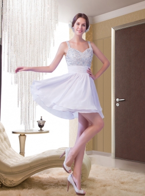 This white prom dress will show your fun side! The spaghetti straps and bust overflowing with shining beading tends to show off a well-toned body. A coordinating waist sash adds interest and detail to the mid-section of the dress. The mini-length airy chiffon skirt sways beautifully across the floor when you move, as if you're floating on air. This simple design never make you sacrifice your elegance and sensuality!