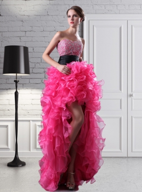 If you are looking for a unique dress to help you put your best fashion foot forward � look no further! This gown is definitely on the cutting edge of fashion. It features a sweetheart neckline and a bodice made entirely of silver beads. The midsection of the dress is decorated with a wide blank band. The skirt asymmetrical - short in the front almost resembling a tutu and then floor-length in the back. It accents a lot of ruffles on the skirt. A zipper up corset style closure in the back secures the dress in place. Just a fun and funky dress for those looking for something a bit different.