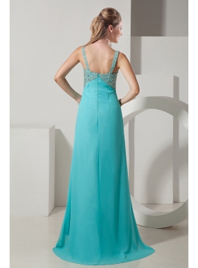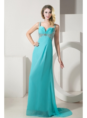 Sexy blue prom dress is perfect for any hot little number! The structured bodice has straps adorned with shining beading and a modified sweetheart to contour your well-toned body. The splendid beading forming tri-angle symmetrically placed around the bottom bustline to back that creats a illusion of a fuller bust. The romantic chiffon skirt falls from the high waist to cascade to floor with a train. A zipper closure back completes a marvelous look.