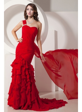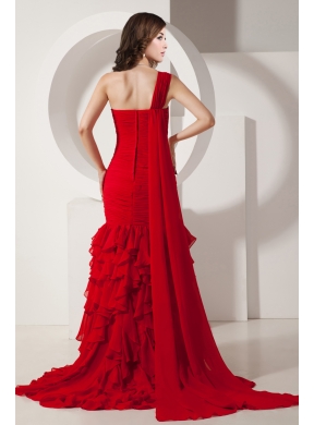 Passionate temperature is displayed entirely. What's more, no matter what color you chose, the amazing effect won't lose. This red prom dress makes you on fire when you wear it. One shoulder strap and ruched bodice release your sexy. The unique skirt is a long and winding series of ruffles besieged in luxurious chiffon all the way to the floor with a little train in a pretty mermaid shape. The zipper and lithe, airy chiffon ribbon complete overal look.