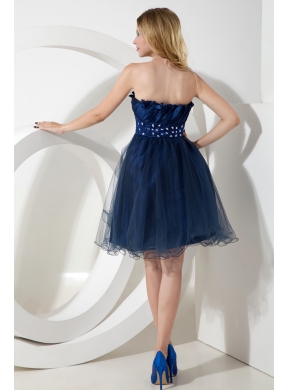 Get the look all your friends will envy when you arrive at prom in this navy blue short dress.Its finely ruched, wraparound bodice is topped off by a straight strapless neckline trimmed by exquisite flounce which runs down the back. A brand and wide ruched sash cinches closely at the empire waist and is punctuated by dreamy beaded floral accents.The ethereal tulle overlay adds an ambiance of romance!