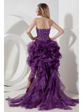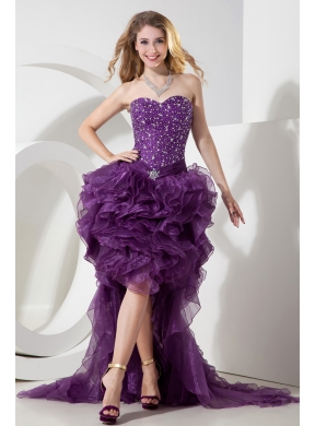 This short style is sure to wow! The crystals and bead works on the form-fitted bodice throughout makes you be the lightspot wherever you are. A pleated waistband with crystals gathered in the midsection is more girly. What makes this already shimmery dress more sexy and charming is the high-low skirt accented with multi-tiered ruffles in amazing organza. A brush train on the back will show off your passion. The zipper up closure finishes the fabulous look. You can dance the night away in this distinctive dress!