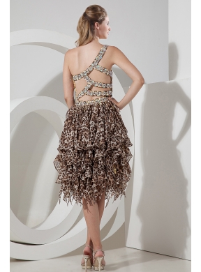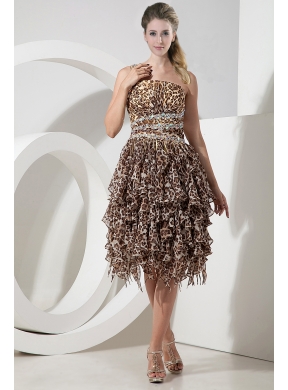 Get the attention you deserve for your prom or formal in this sensational dress with all-over leopard print. It features a one-shoulder strap bodice with a band of rhinestone embellishments across the right shoulder and another triple row of embellishments across the midsection. The straps crisscross the open back enrich the sense of sensation. The short asymmetrical skirt made from lots of scraps of leopard-print fabric resemble feathers from a distance. If you're looking for a unique dress to help you put your best fashion foot forward � look no further!
