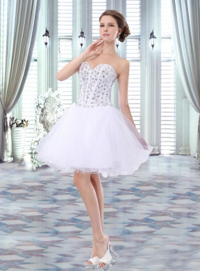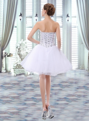 This dress will make you the talk of the big day! Fashionable strapless sweetheart neckline with sparkling beading accents on the corset bodice to make the dress stunning. Three white bands start from bust down to the middle of the belly add more cute for you! The mini-skirt is unique shaped by layers of tulle that make the dress puffy. Sweet and sassy!