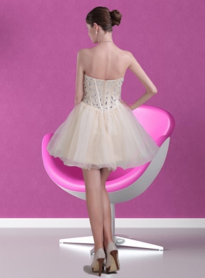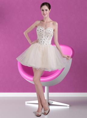 Sexy and sophisticated.The sweetheart neckline bodice accented by the asymmetrically all-over sequin and crystals details flatters most figures.The champagne short charming prom dress contours your curve.The tulle makes the dress more puffy.