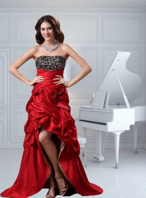 This stunning elegant red and Leopard dress has a rommantic charm that no others can conquer. It features a straight neckline, beaded texture on the bodice and a gorgeous ruffled skirt with a split on the front that creates a sexy and sassy look. Several hand flowers add beauty to the midsection. The back of the dress features a lovely ruffle train and a flexible lace up closure.
