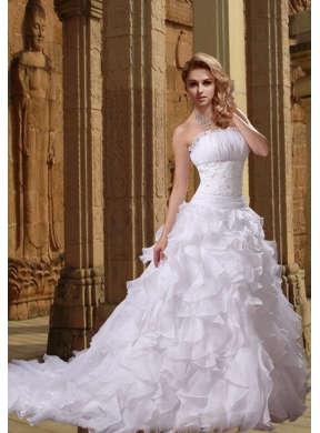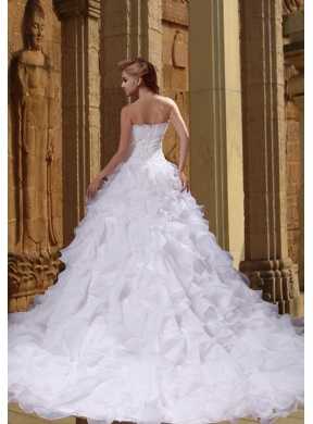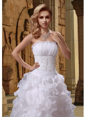Go for a charming, feminine look on your wedding day in this pretty gorgeous dress . This pure dress has a strapless lacy neckline and pleating through the bust. The waist made from different fabric trimed with nice appliques to get a fantastic effect. The skirt has a distinct A-line shape and fluttering tiers of ruffles for a soft, romantic look. This gown is full length. A zipper up closure in the back secures the dress in place.