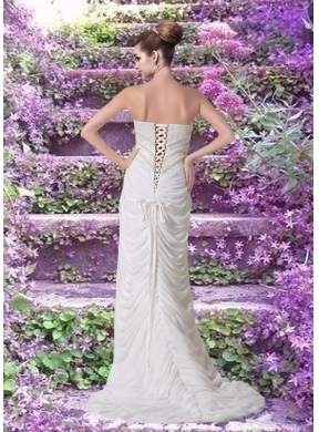 A fitted and strongly embellished bodice gives this strapless dress an imperial quality. The inverted triangle shape beadwork makes the dress so unique. This strapless design features a full-length skirt that parts in the front to form a high slit that will show off your legs, as well as your heels. The overlaping effect makes the dress luxurious yet elegant. An elegant lace up back finishes the gorgeous design.