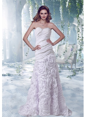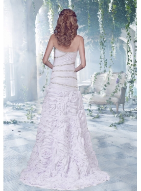 This gorgeous strapless wedding dress is sure to work wonders for your big day! Fitted pleated bodice adorned with gorgeous beaded asymmetrical lines to flatter your figure. The big rosette for accent drenched from drop waist to floor make this amazing dress to catch your eyes. A hidden zipper makes for easy off and on and secures the dress in place. You can dance to your heart's delight.