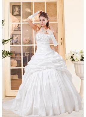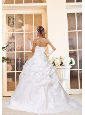 If you are looking for a princess like wedding dress, this one is the one you can't miss. It features a strapless bodice and exquisite appliques with clear beading on the bodice as well as the waist make the dress dazzling. The first taffeta layer of ruffle starts from the waist creates a fashionable look. The lace up back complete the look. This eye-catching dress is a dream of every girl.