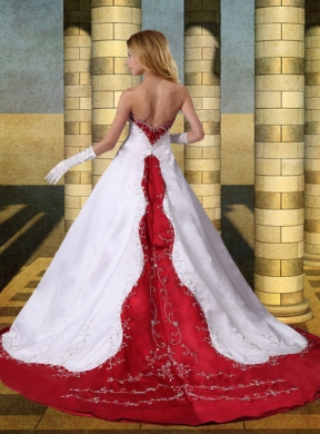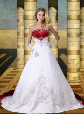 All eyes will be on you if you choose this wedding dress! This new designed dress is made of high quality satin which make it wonderful and gorgeous. The big skirts are balanced with tiny, form-fitting bodice that highlights the bust and a feminine defined waist and contrasting red and white color bring a dramatic effect. This kind of wedding dress features strapless neckline. The embroidery material decorates on the dress to flatter its vintage style. Ball gown silhouette with train cascades to floor and sweeping. Wear it, the bride looks beautiful no matter which angles people look her!
