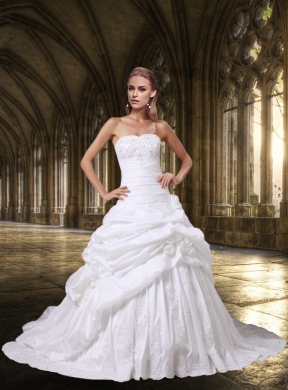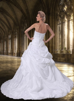 A fabulous taffeta wedding gown! If you're looking for something totally different and unique style, this might be just the dress for you. The white dress features a fashionable strapless sweetheart neckline with exquisite appliques accented on the bust which extends to the back. The symmetrically pleated bodice is accented with cute hand-made flowers and the pick ups makes the dress romantic. The lace-up back and an elegant train finishes the look. You will have the chic and romantic wedding ceremory.