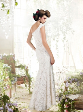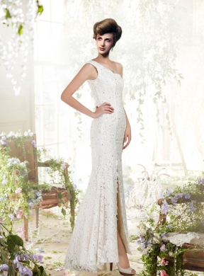 Are you looking for a dream dress for your wedding?This must be the one you can't miss. The white bridal dress is made of delicate lace material and soft silk satin. It features a fashionable and elegant one shoulder neckline. A slit cut from the knee creates both a sense of allure and elegance. Glimmering beading scatters throughout which make the dress sparkling. The bottom of the skirt is composed of soft and clear lines which creates a lovely shape. Zipper up on the left side make the dress easily on and off. A sweep train completes the whole look.