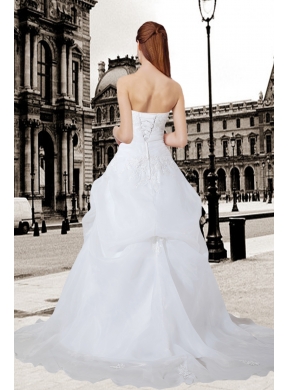 This is the perfect and pure dress for your wedding! The strapless bodice is full of delicate appliques and nice pleats that show your perfect curve. The rugged skirt add more details to the dress while the lovely train makes the dress so romantic. A lace up corset style closure in the back secures the dress in place. Make your wedding day everything you'd hoped for in this pretty bridal gown.