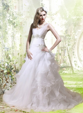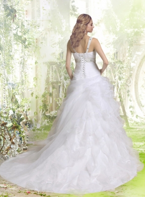 You will be the most beautiful bride in this gorgeous wedding dress. This fabulous gown features a plunging V-neckline with two wide shoulder straps. Shimmering beading decorates the waist and the right hip where all the ruffles gather. The multi-layered skirt with romantic ruffles has a small train behind. A lace up corset style closure in the back secures the dress in place.