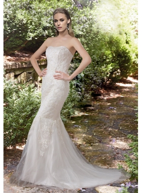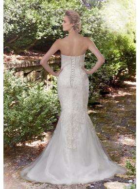 Wrap yourself in the soft fabric of this trumpet bridal gown and look and feel sensational. Its strapless neckline also has a wrap-style bodice hugs curves in all the right places. The bodic and the skirt is complete with chic lace fabric which turns heads. The tulle skirt is complemented with a sweep train decorated by tiers of tulle layer gives out the sophisticated feeling. This breathtaking dress is completed with corset closure.