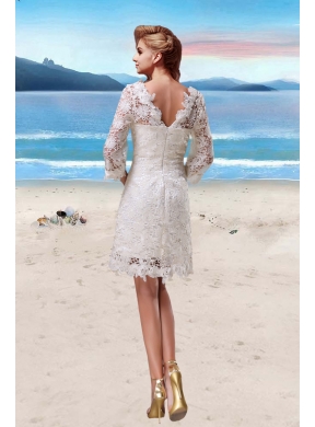 This fantastic evening dress features scoop neckline and sheath silhouette. V-back with hidden zipper closure. Made of lace and satin materials in ivory color. This lace dress is also fit for wedding reception.