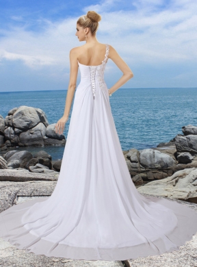 If�you're�a�fan�of�the�fancier,�finer�things�in�life���this�might�just�be�the�dress�for�you. It�features�a�gorgeous�one shoulder�bodice�with exquisite appliques and hand made flower embellishments on the strap�and the pleated close-fitting bodice.�The floor length skirt made in flowy chiffon encrusted with clean lines and folds creates a soft feeling. Delicate lace up closure and the long train will have heads turnning with no doubt. Isn't it what you are looking for?