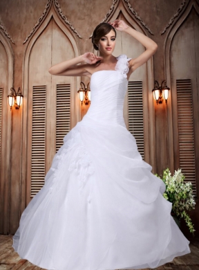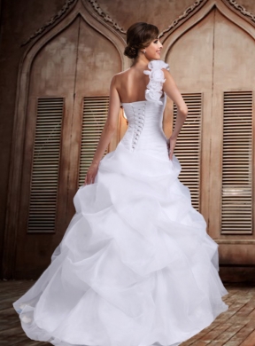 This one features a lovely strapless bodice with boning details and exquisite ruchings throughout. What's more, the one shoulder style adorned with roses adds more flavor to attract more attention. The full accordion pleated A-line skirt with the chic rose decorations create a beautiful shape to form a sweep train in the back. A lace up back completes this fabulous design.