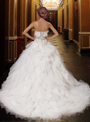 Have you ever dreamt what you will be like in your wedding day? Of course, you are the most beautiful bride when you are in this gorgeous wedding dress.The white strapless beaded feather gown with ruffles is your perfect choice in your most important day in your life. Fitting bodice design with trim feather decoration with a beaded waitband make the gown so beautiful and sassy. Besides, the ball gown design with a chapel train makes it much more cute and lovely as if you are a princess in a fairy tale.