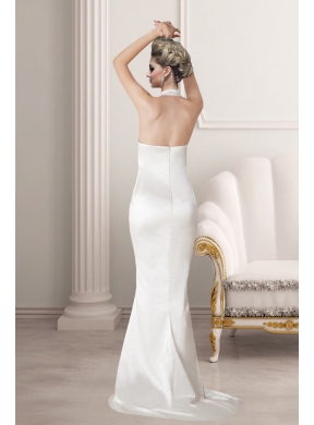 You will look like a million in this elegant white prom dress! This one features a halter top covered with trapezoid shaped fabric and close fitting to hug curves and outline the silhouette of your body. The sneath style dress tends to show off a well-toned body. The low open back has a hidden zipper and a brush trian finish a gorgeous look. You're sure to land on everyone's best dress list!