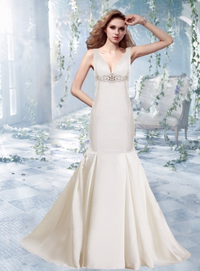 This vintage-inspired gown is sure to make you the envy of most people with its classic design. It features a V-neck bodice. The midsection of the dress features a beaded belt, which is very flattering. A hollow out and pretty bow in the back highlight the design and secure it in place. The mermaid-style skirt flares out slightly and falls in beautiful pleats and folds that create a beautiful silhouette when worn. Just a great and classic style � perfect for any social function on your calendar.