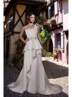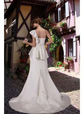 Pure captivation abounds on this gracious wedding dress will definitely leave you a lasting impression.It has a pretty one shoulder bodice accented with beaded ribbon, which helps to curve the waistline and flatters the figure perfectly. The one-shoulder strap crosses the body in the back as well, blending perfectly into the design. The skirt is flowy and gentle, the hem is rounded and extends into a beautiful court train in the back. It pools beautifully at your feet and moves with you when you walk. So gracious � so gorgeous � perfect for any bride to be.