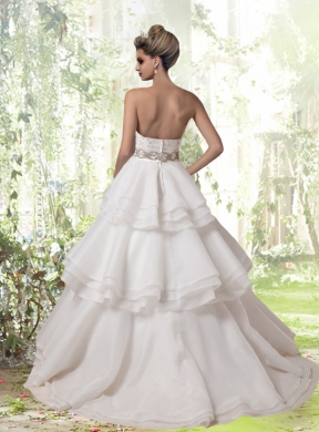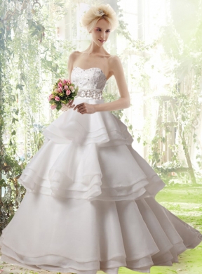 This fabulous wedding dress features a sexy sweetheart neckline and an romantic layered skirt. The strapless bodice is heavily embelished by shimmering beading and the midsection of the gown is cinched by a gorgeous heavily embellished belt that perfectly complements the rhinestones on the bodice. The layers in the skirt and the chapel train make the dress like a blooming flower. A zipper-style closure secures the dress in place and ensures a great fit.