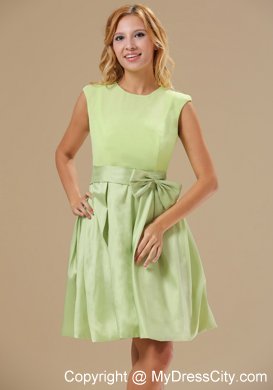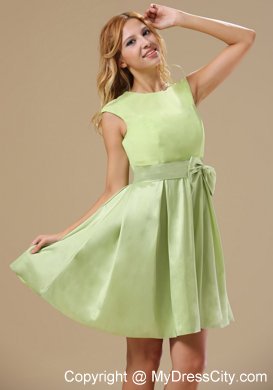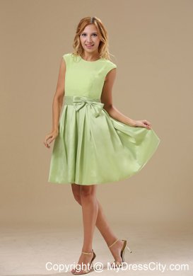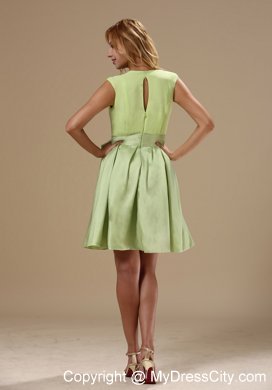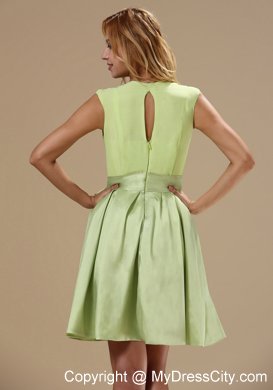 This classic yellow green gown for prom is given a modern updated look with a unique scoop neckline. It features a cap sleeves bodice with high quality fabric that looks like modern art made wearable. The midsection of the gown is cinched by a gorgeous belt that perfectly. The light and airy skirt is featuring a knee-length hem. The simple zipper in the back of the dress secures it in place and makes for easy off and on.
