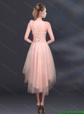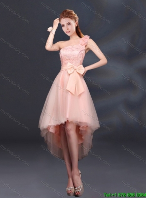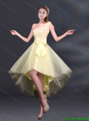 2015 New Style Bowknot High Low Lace Up Dama Dress with One Shoulder