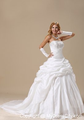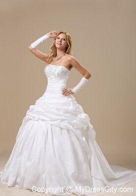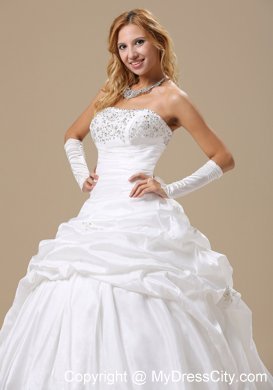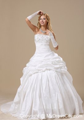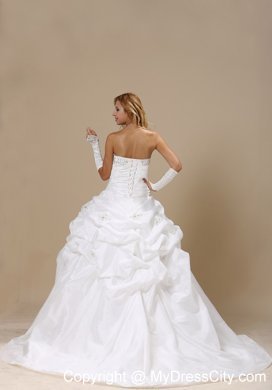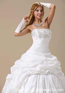 If you are looking for a princess like wedding dress, this one is the one you can't miss. It features a strapless bodice and exquisite appliques with clear beading on the bodice as well as the waist make the dress dazzling. The first taffeta layer of ruffle starts from the waist creates a fashionable look. The lace up back complete the look. This eye-catching dress is a dream of every girl.