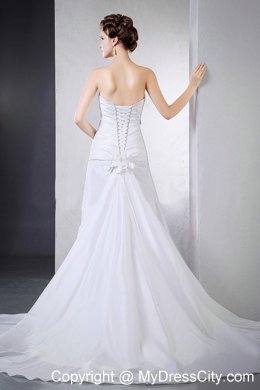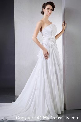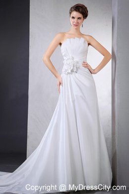 A special day calls for a special dress and this one is sure to suffice. It features a fan-sharped strapless neckline. The fabric is accented with lots of ruches on the waist area. The hand made flowers decorate the waist line and the back. The skirt is fabulous and full, thanks to the soft fabric that gives it its wonderful shape. A corset-style closure and pretty sweeping train complete this fairytale-inspired design.