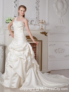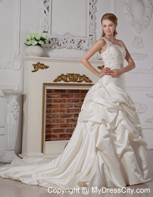 Your wedding dress should be the reflection of your taste. This elegant one-shoulder gown must be a perfect example! The ruched bodice is covered with gorgeous beaded lace appliques which continues to the waist shows the exclusive curve. The skirts gather naturally to create a vintage bubble-look. The sweep train sways beautifully when you move, a classic lace up closure finishes the look.