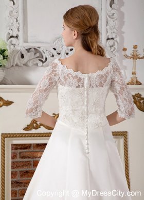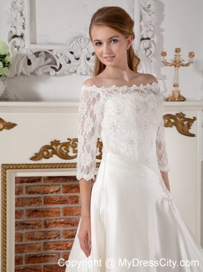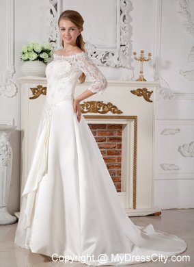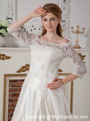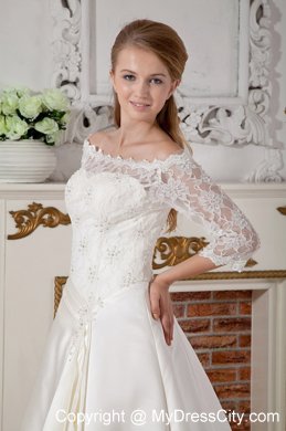 This white strapless wedding dress features a scoop neckline bodice with long sleeves in chic lace fabric that is fully embellished with intricate embroidery. The style of the dress is simple yet elegant, especially the ruched decoration in the middle of the waist area adds interest to the midsection. The floor length skirt flows beautifully with a lovely sweeping train that pools in a pond of fabric. The closure encrusted with fastener extending to the very bottom of the train, which makes the dress standout. You can't miss it. Take it home now!