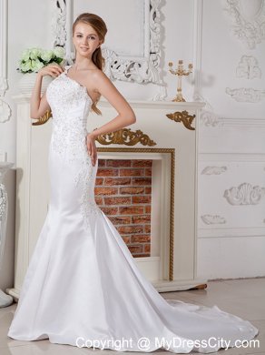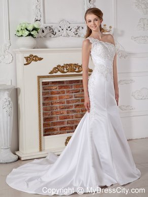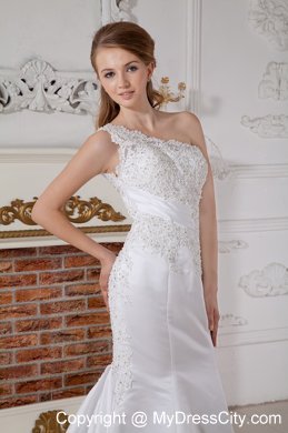 Stunning and sophisticated are two words to perfectly describe this white dress. It features a gorgeous one shoulder bodice that's heavily embellished with intricate appliques and exquisite ruching decoration. While the mermaid style accented with scattered appliqued embellishment flows freely to create a pretty sweep train. A zipper up back with quintessential pleats finishes the look.