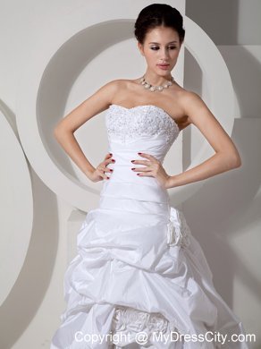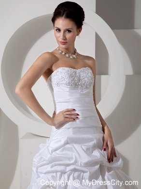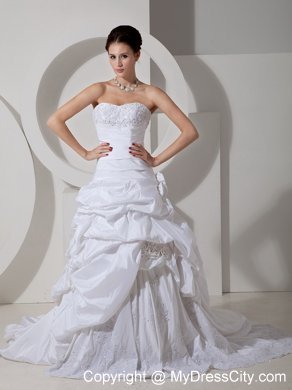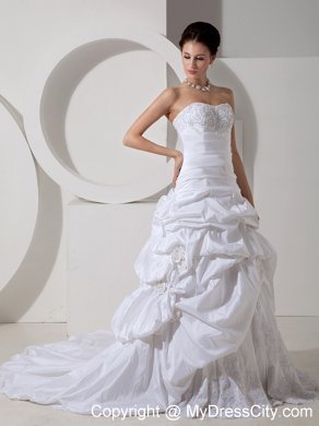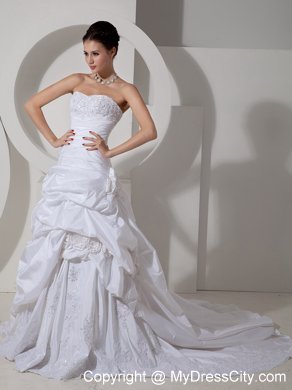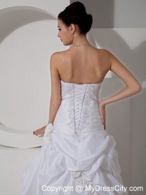 Elegant and unforgettable, you are a star in this lavish A-line wedding dress. Intricate embroidery with scattered bead works on bodice is stylish and creates a stunning slimming focal point. Pleated waist emphasizes your curves ideally. The floor length skirt encrusted with the same embroidery and beads covered with a bubbled out layer embellished sparsely with hand made flowers and with a high-end hemline. A sweep train in the back and a amazing lace up closure finish the perfect look.