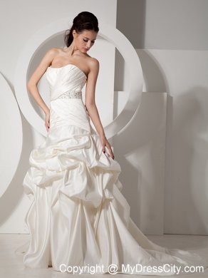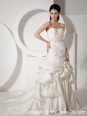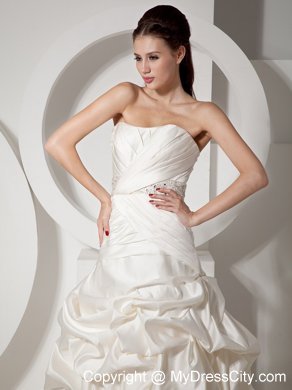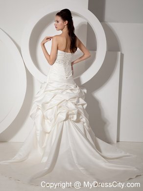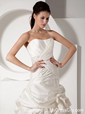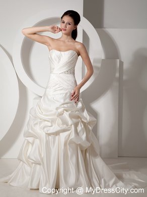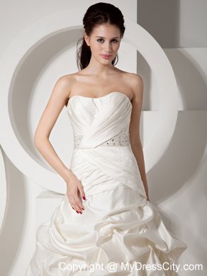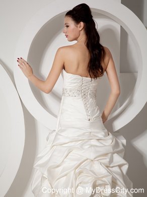 Stylist will perfer the perfect style! It has a slight sweetheart neckline with structed pleating on the corset bodice. Beaded band on the waist shows your figure charming. The pleating continues to the hip. The skirt is covered with delicately designed pick ups to create a bubble-like look. Favorable lace up closure with the long train adds the charm. You will be the focal point on your special day!