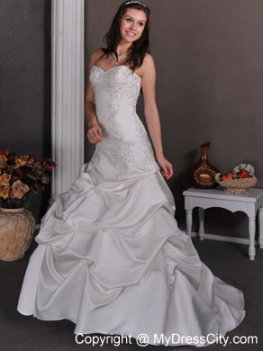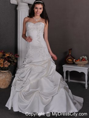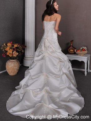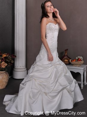 You will definitely delight your sweet' heart when you put on this luxurious white wedding dress! The structured bodice to wrap the hips embellished with exquisite beaded appliques features a modified sweetheart. The pretty skirt has many tiers of ruched fabric and train a spectacular rippling wave appearance. The back features a corset-style closure that ensures a perfect fit.