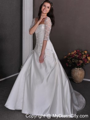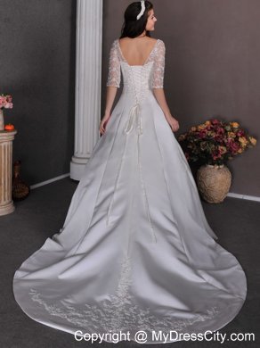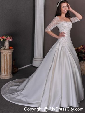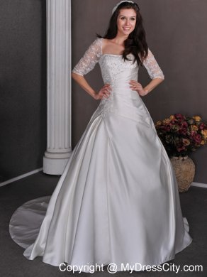 This one will put you to mind of a traditional southern belle, when you put on this white wedding dress! It is highlighted with a straight neckline and half sleeves wraping the shoulder on the bodice with beaded appliques for accent. The A-line skirt with pleating has a court train adorned with a bunch of flower that cascades to the floor. A lace up corset style closure in the back secures the dress in place.