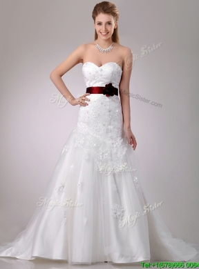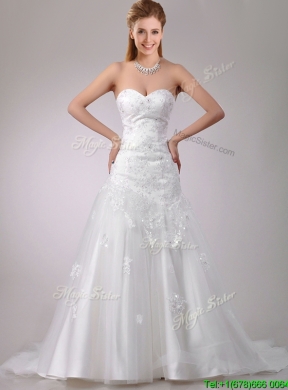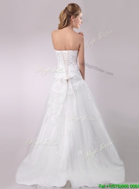 Lovely Be-ribboned Beaded and Applique Wedding Dress with Brush Train