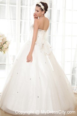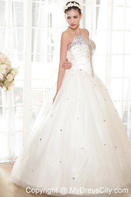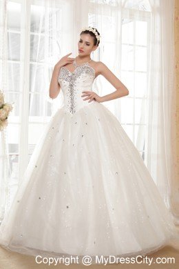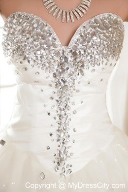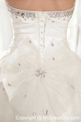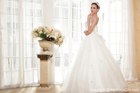 You will be the most beautiful bride in the world in this amazing white wedding dress! This creation is accented with a modified sweetheart and overflowed with dazzling beading, just like the firework shot into the sky. The A-line skirt is scattered with beading and overlayed with a sheer tulle, which beautify the dress. The back has the trim of the corset style closure and lovely bowknot assuming a fly butterfly. How wonderful!