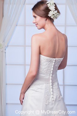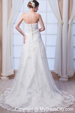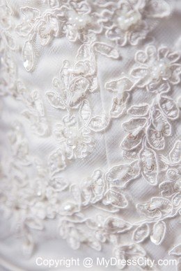 This wedding dress is the way to go if you are looking for a style to show off your curves. This fitted bodice is consisted of a modest sweetheart and a outstanding waistband adorned with a brooch in the mid. The exquisite lace is over-layed with the dress for accent, which outstand your charm. The A-line skirt has a court train that upgrades your taste. The back has clasp handle that adds extra special on the dress.