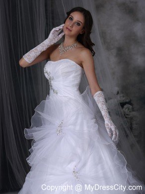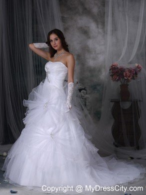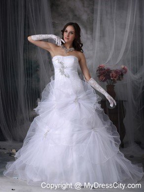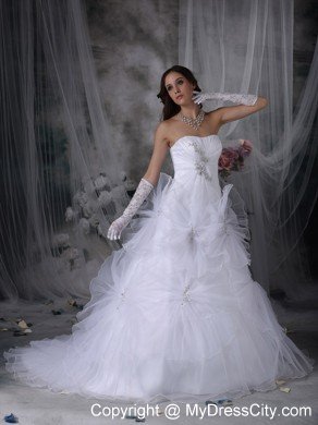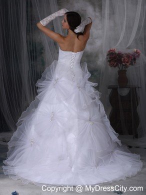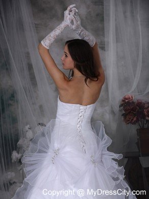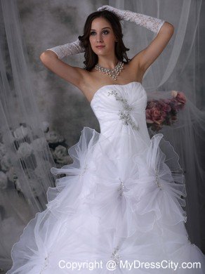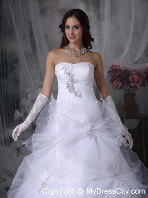 Looking incredible is a snap when you have this exquisite strapless ball gown at your disposal! Its form-fitting bodice is completely coated in asymmetrical ruching. The embroidery and beads at the side will definitelt catch your eye. Uniquely exaggerated floral embelishments cascade down the very bottom. The elegant lace up back adds more charming to the perfect design.